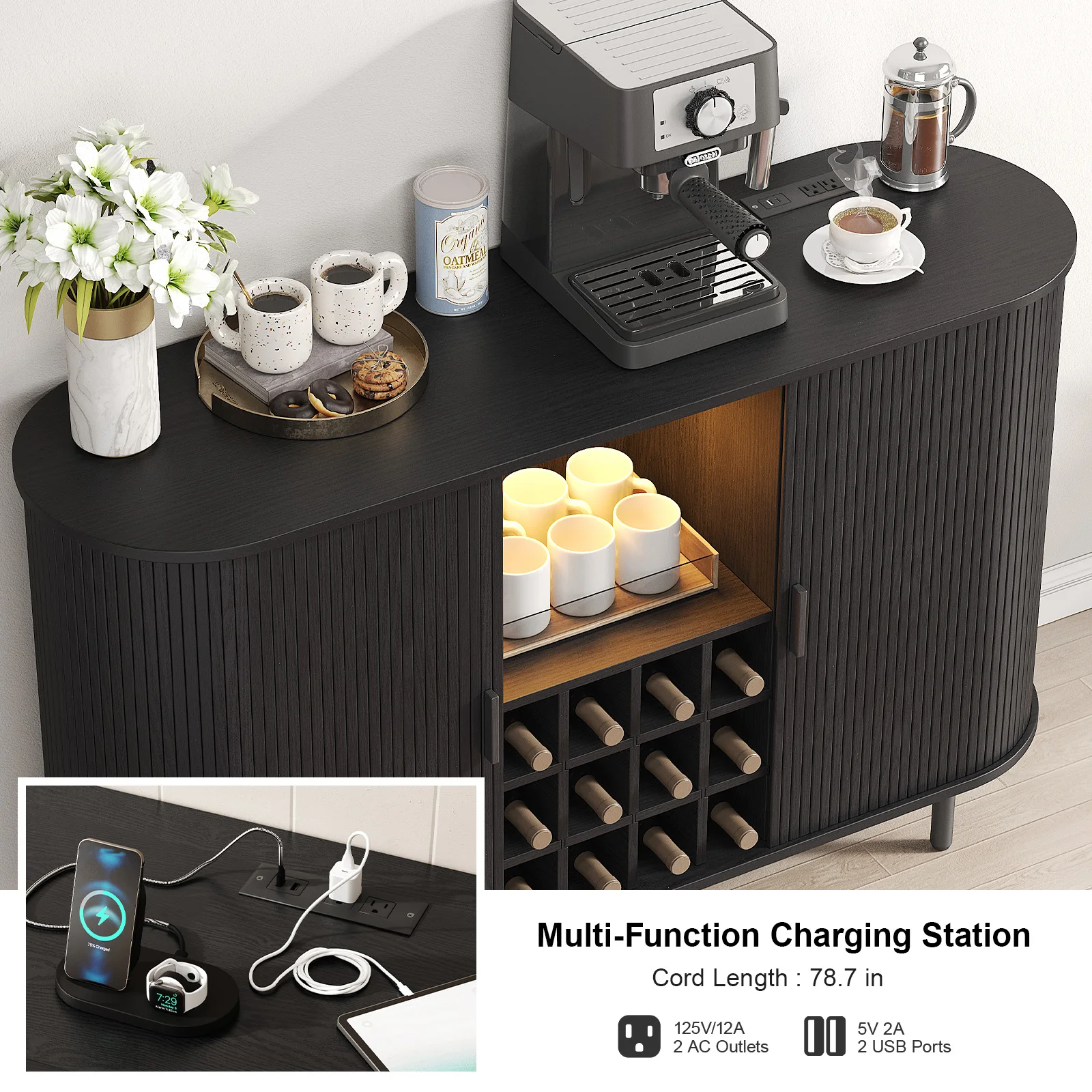 Upgrade your space with our versatile wine storage cabinet, equipped with RGB LED light strips with remote control, customizable color and brightness to create the perfect ambiance. The coffee bar cabinet also includes 2 AC outlets and 2 USB ports for charging your devices. Use it as a buffet cabinet, coffee bar, storage cabinet, TV cabinet, or entryway table for added convenience.